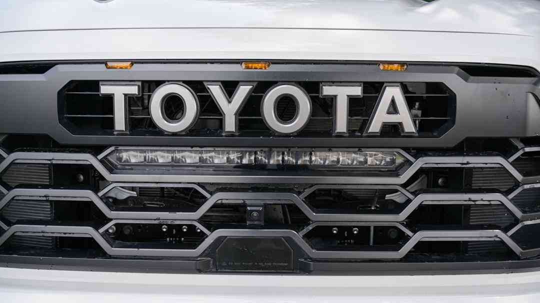 Black “TOYOTA” heritage grille with integrated LED light bar and amber marker lights